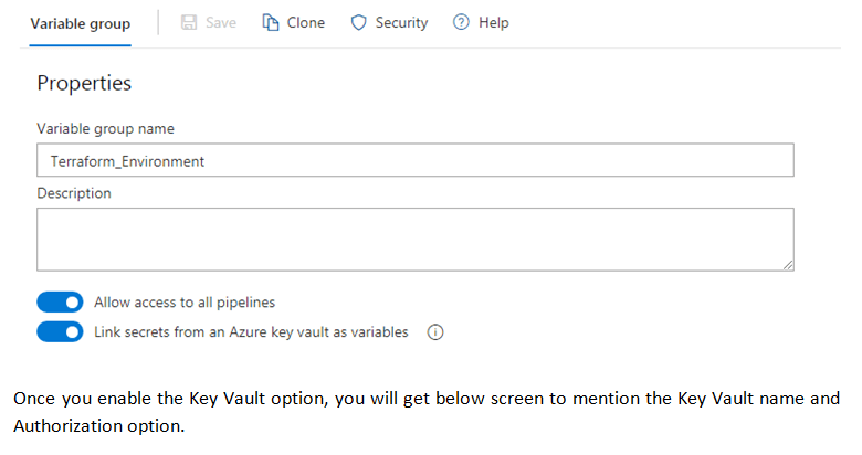 • Give a meaningful name to the variable group. We have named the group as Terraform_Environment, which means this variable group will store all environment variables of Terraform which are sensitive.