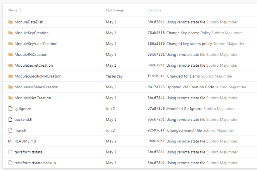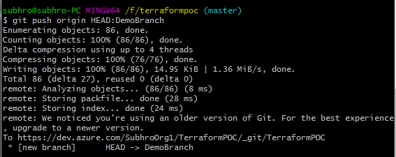 Notice that the directory .terraform is not pushed to Azure Repo, because we have included it in the .gitignore file. We do not need this folder in Azure Repo, as this folder contains all the files and plug-ins which are used by local computer.
