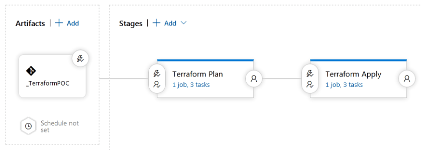 This approach will allow Terraform executors to review the output of Terraform plan, before they execute Terraform apply. Once the reviewers are satisfied with the Terraform plan result, they can run second stage and execute Terraform apply.