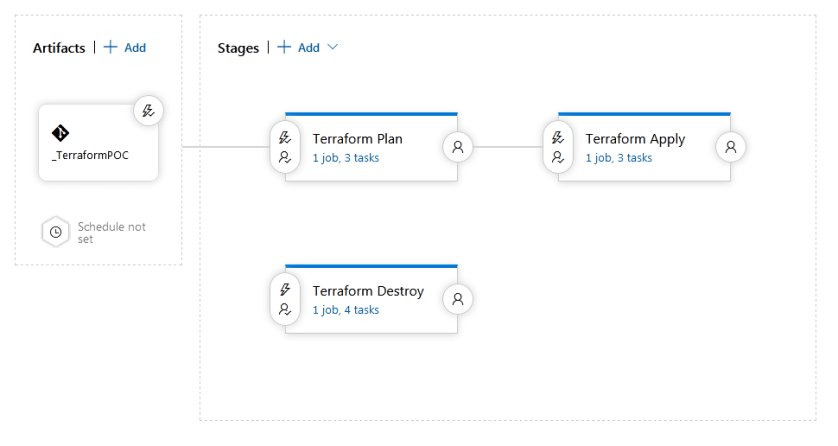 6) Terraform Plan and Terraform Apply are divided into two different stages. This makes the release pipeline safer to deploy, as the executor can review the Terraform Plan output and can assess what changes will take place in the target infrastructure, when this code will be deployed.