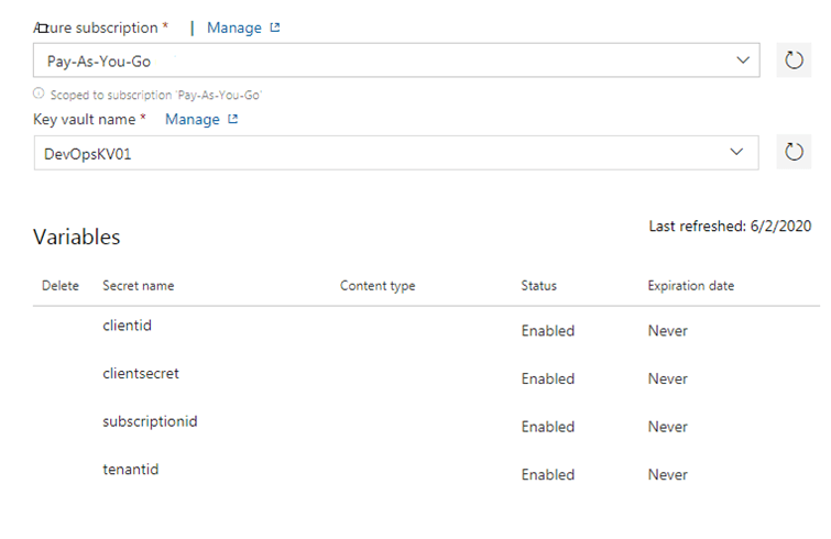 Since we want to pull the secrets from Azure Key Vault, enable the option Link secrets from an Azure key vault as variables.