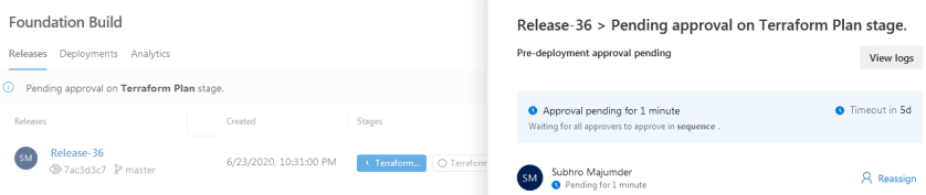 Now that the master branch is updated, the release will be triggered. However, the first stage also need approval to proceed.