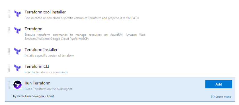 Once you search with terraform again, you will get few results related to terraform. I have used the Run Terraform task published by Peter Groenewegen for Terraform Init and Plan. You can try any other task as well.