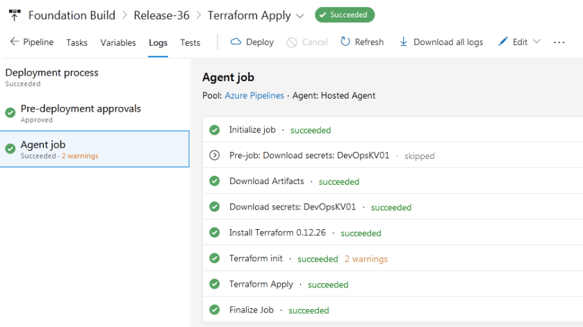 Once approved, the Terraform Apply stage will run and deploy target infrastructure in Azure.