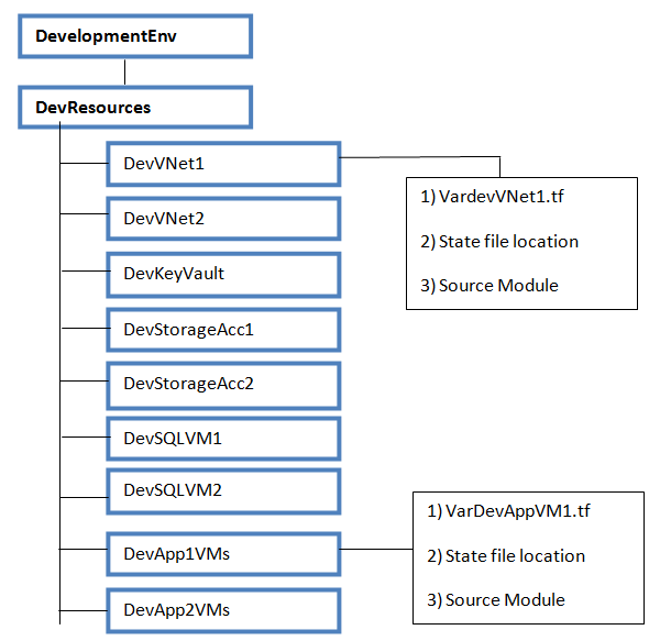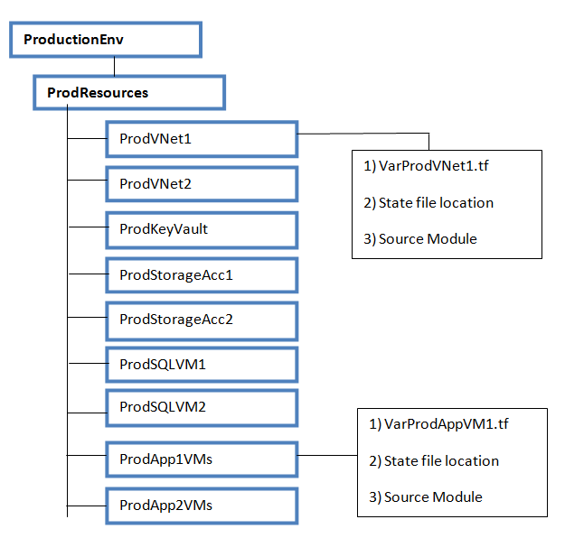 • Each folder should contain variable file, state file location and source module folder. The code will be deployed using the corresponding module using variables which are defined in this folder.