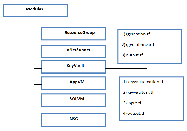 • Create separate module for each infrastructure component. For example, if you are going to build an Azure Foundation through terraform code, use separate modules for Azure VM, Azure Network, Azure Key Vault, Azure VM and so on. Name each module folder matching with corresponding infrastructure component.