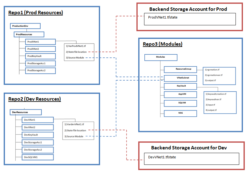 As you can see, we have used three Repos. Repo1 contains code for Prod environment, Repo2 contains code for Development environment. Repo3 contains all module folders, which will be used by Repo1 and Repo2.