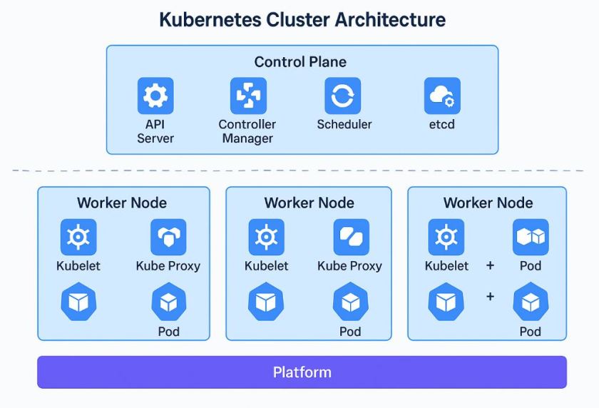 Kubernetes follows a master-worker architecture. It consists of a Control Plane (or Master Plane) that manages the overall cluster, and multiple Worker Nodes where application workloads run. This architecture supports scale, high availability, and decoupled control logic.